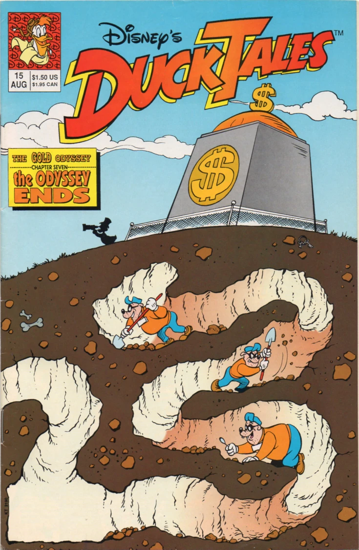 Most of the Disney Comics DuckTales title's run was devoted to three different multi-part adventure stories - "Scrooge's Quest" (published from issues #1-7), "The Gold Odyssey" (issues #9-15), and "A Dime in Time" (issues #17-18). The first two arcs were later reprinted as trade paperbacks by Gemstone Publishing in 2007 and 2008.